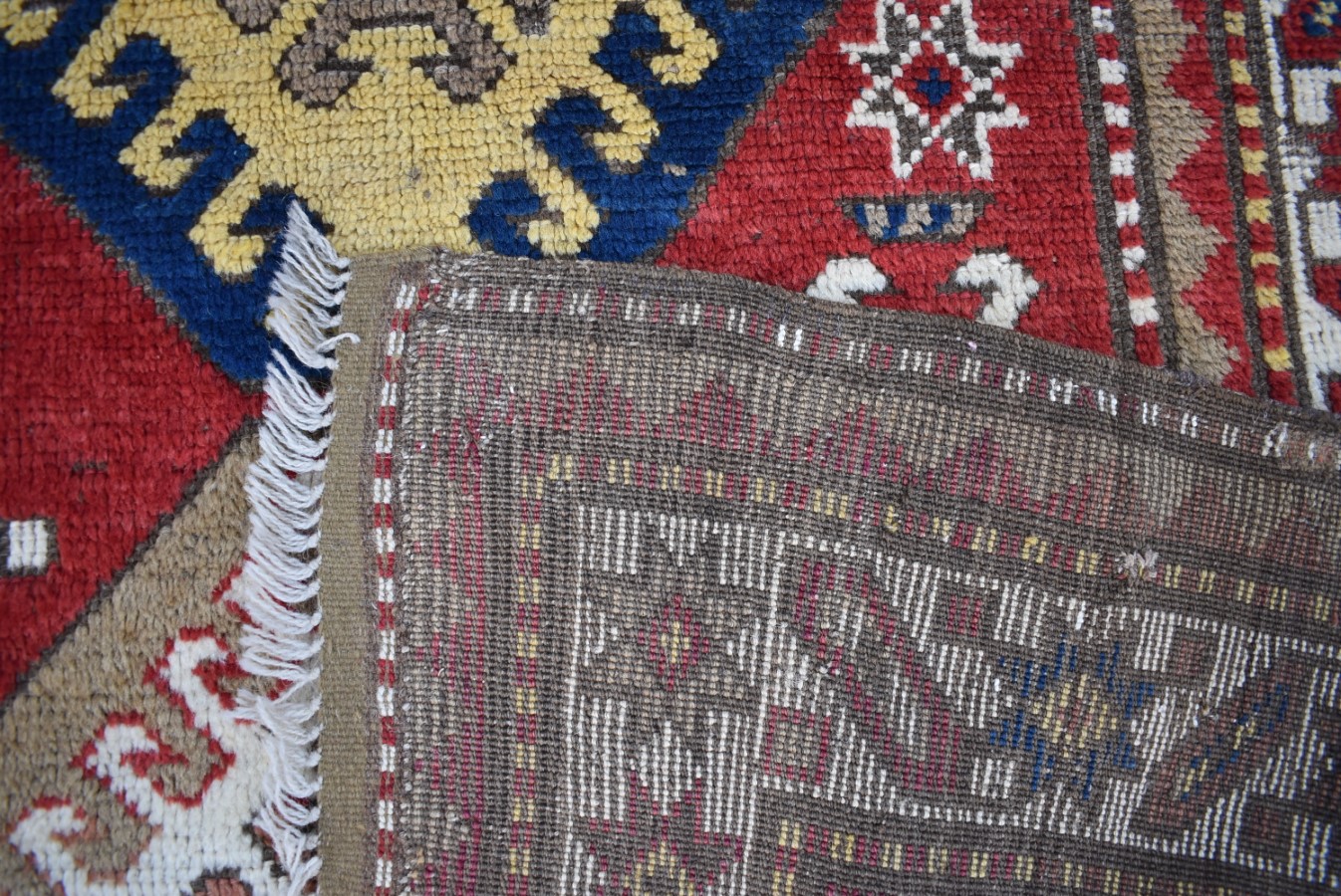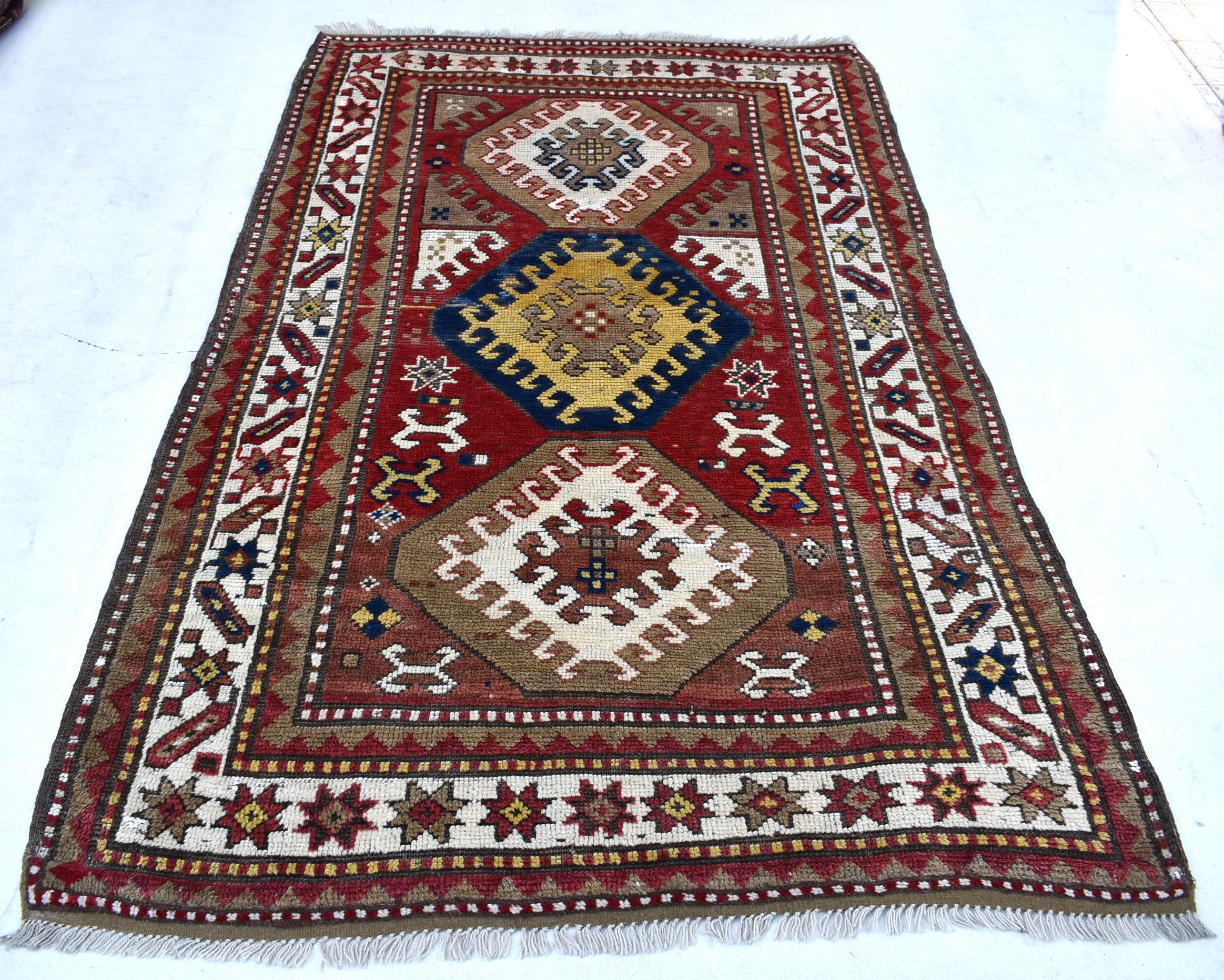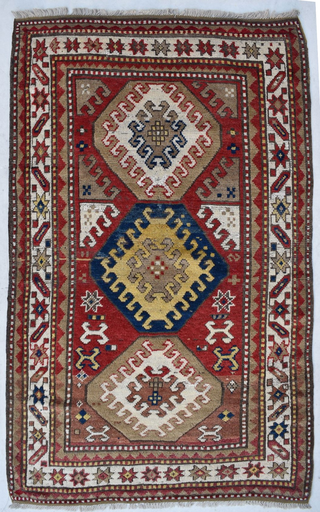 1.88x1.17=2.20 m2, 80-90 YEARS OLD, HAND FIBER, ROOT DYE, ANTIQUE CATALOGUE PIECE IS IN GOOD CONDITION, THERE ARE CHARACTERISTIC STAR PATTERNS ON THE BORDER AND DRAGON MOTIFS ON THE INSIDE FLOOR.