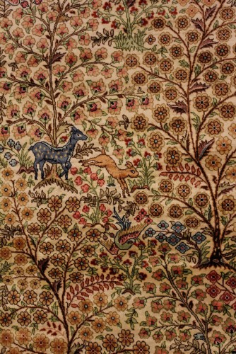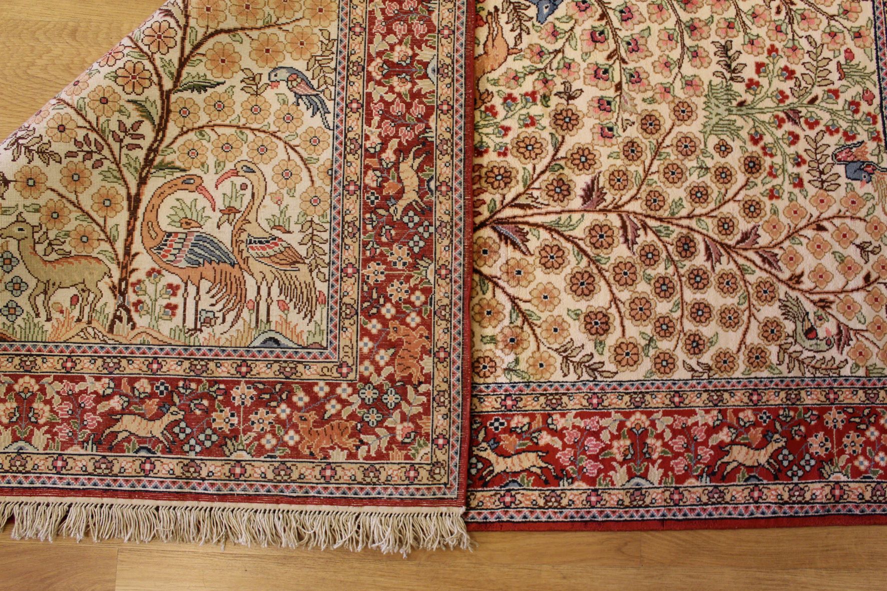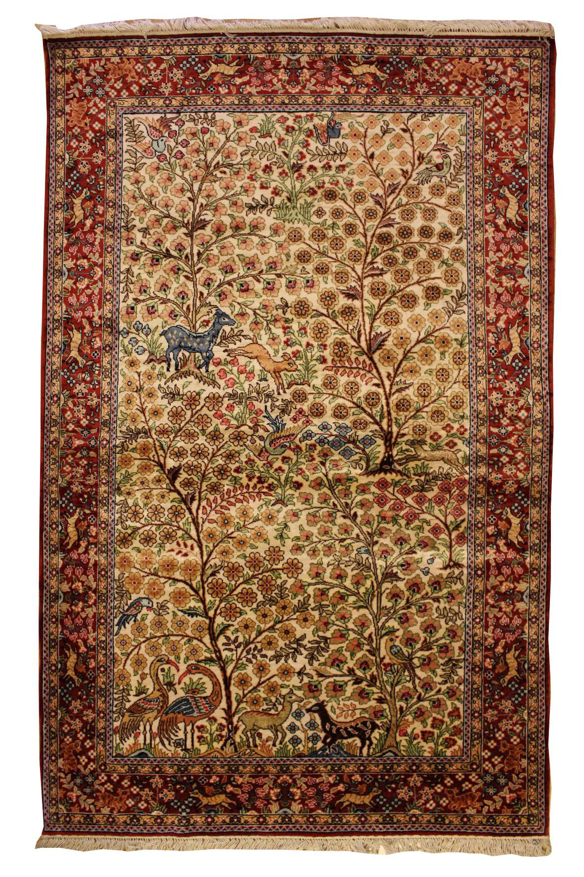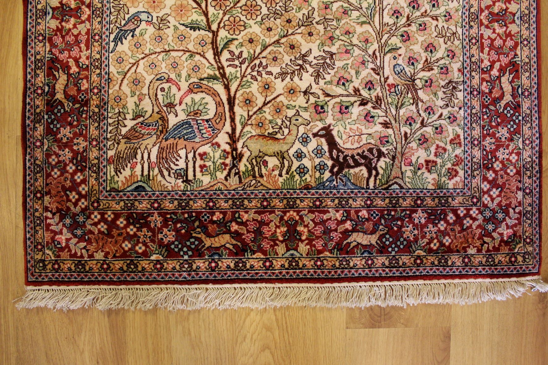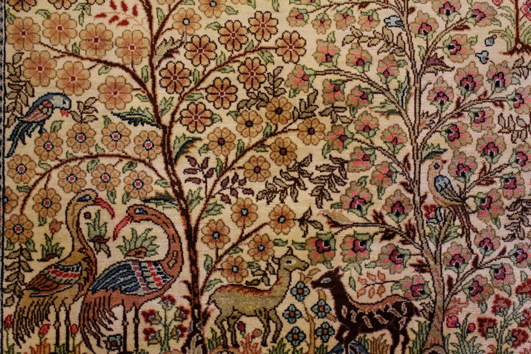 1.54x0.75=1.45, SUPERIOR QUALITY WEAVING NEW PERSIAN SILK QUM CARPET, 1 CM2=100 KNOTS(10X10), SPECTACULAR COLORS & ANIMAL MOTIFS USED. VERY UNIQUE PIECE.